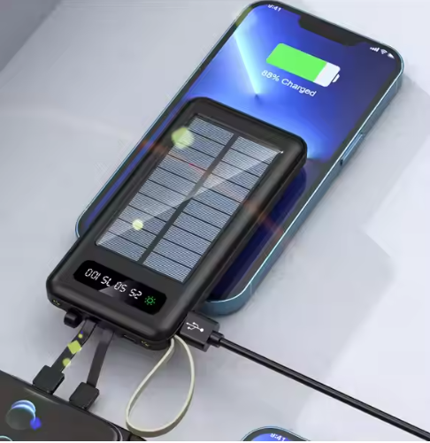 Mantén tus dispositivos siempre cargados con nuestra batería externa solar de 10.000 mAh, diseñada para ofrecer energía confiable y sostenible en cualquier lugar. Perfecta para viajes, aventuras al aire libre o como respaldo diario, esta power bank multifuncional es la solución ideal para no quedarte sin energía.