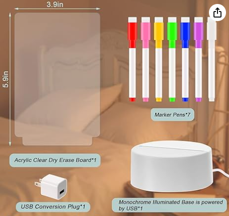 ✨ Diseño Personalizable: Incluye tablero de acrílico transparente, rotulador de tinta blanca con borrador y base LED, permitiéndote escribir mensajes, dibujar o dejar notas.